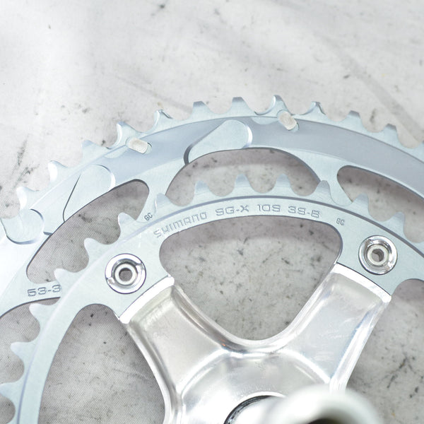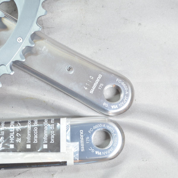 Double 10 speed crankset in 172.5 mm. Rare new old stock. NOTE: Does not include crankarm fixing bolt. These are commonly available from aftermarket producer's under "M18 crankarm fixing bolt" - be sure to get M18 for this crank, as opposed to the more common M20 size most Shimano cranks use.